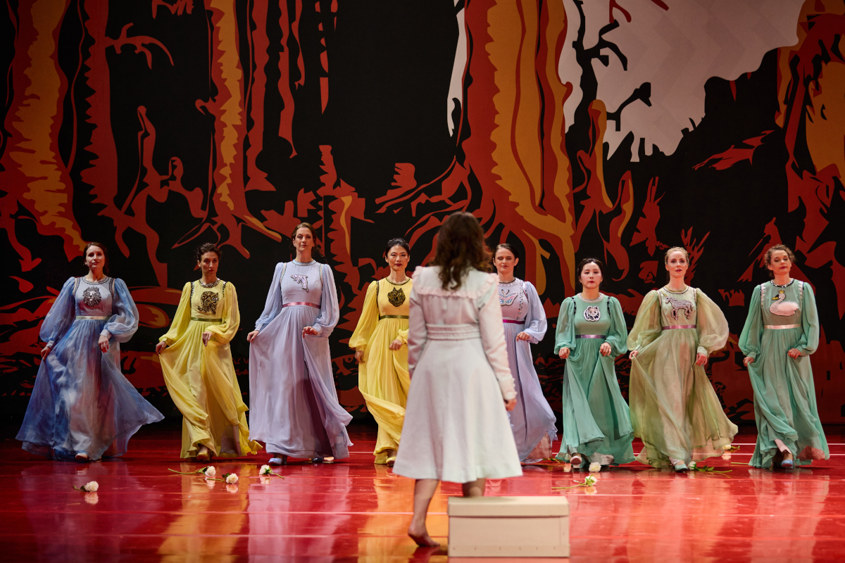 Dass die Jägertruppe und die Schützen im Paintball-Look auftreten und die stets treffsicheren Zauberkugeln, deren letzte dem Teufel gehört, mit den modernen Kriegsdrohnen parallelisiert werden, ist also nicht das Problem, auch nicht die Tatsache, dass die Wolfsschlucht von einem von Voxi Bärenklau erstellten Videozusammenschnitt leider schon alltäglich gewordener Kriegsbilder (Ziel und Angriff) überlagert wird. Im Gegenteil: Im künstlichen, von Nina von Mechow beeindruckend ersonnenen Setting von linolschnitthaften, gleichsam zweidimensionalen Riesendekorationen, auf denen der Wald so orange glüht wie die Paintball-Kostüme und auf deren Felsen man Fratzen entdecken kann, die zu den sechs immer wieder über die Bühne laufenden Gestalten eines alpenmäßig-süddeutschen-böhmischen Volksaberglaubens trefflich passen, macht es Sinn, die zentrale Gruselszene in einer so artifiziellen wie realistischen Gegenwart zu verorten. Dass der Geist der Mutter („so lag sie im Sarg“) als über die Bühne geschobene Riesenfigur eines Skeletts mit Lusche im toten Mund daherkommt, ist dabei nur witzig – und inkonsequent, denn ein das Eigentliche und eigentlich Tödliche aufweichender Humor hat in dieser Interpretation nichts zu suchen. Wie Hans Mayer sagte: „Ein ernst genommener Freischütz ist nichts zum Lachen“. Ausnahmen bestätigen die Regel, aber die Nürnberger Neuinszenierung ist keine Ausnahme, sondern bestätigt nur die Regel.