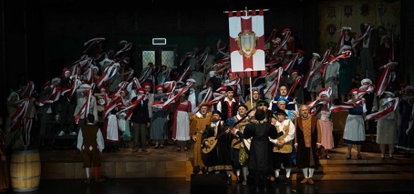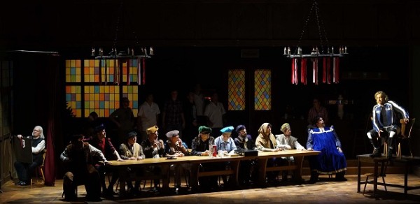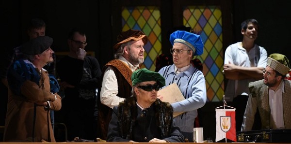 Die verkleideten Meistersinger, am linken Rand: Thomas de Vries (Beckmesser), am rechten Rand: Marco Jentzsch (Stolzing)