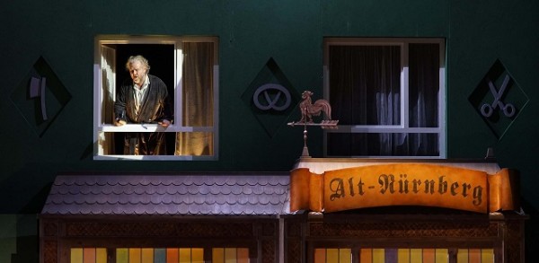 Sehr anrührend gelingt dagegen der Beginn des dritten Aufzugs. Zu den melancholischen Klängen des Orchestervorspiels sieht man ein stilecht eingerichtetes Altenheimzimmer mit Pflegebett und wenigen Möbeln. Darin sitzt Hans Sachs und wirft mit einem Diaprojektor traurig Bilder vergangener Zeiten an die Wand. Zu sehen ist seine verstorbene Frau in ihrem Hochzeitskleid, Urlaubsbilder mit Familie, eine Ansicht seines Schusterladens, der – wie weitere Bilder zeigen – wohl vor Jahren schon aufgegeben wurde, um samt zugehörigem Häuserblock abgerissen zu werden. Die Trauer des alten Mannes überträgt sich auf das Publikum. Es ist der stärkste Moment des Abends. Danach geht es mit der Komödie weiter. Das elektrisch verstellbare Pflegebett und ein Bügelbrett bieten Gelegenheit zu ein wenig Slapstick. Die abschließende Festwiesenszene findet erwartungsgemäß wieder im Gastraum der Kneipe statt, auf dem man ein erhöhtes Podium errichtet hat, dessen Rückprospekt die Stadtansicht zeigt, die man vom Zwischenvorhang kennt. Der Aufzug des Volkes und der Zünfte wird unspektakulär arrangiert. Die kleine Wiesbadener Bühne ist schnell mit Menschen überfüllt. Walther von Stolzing hatte zuvor seine Motorradkluft gegen einen stilisierten Trachtenanzug eingetauscht und ist nun begehrtes Objekt für Selfies mit jugendlichen Fans. Das alles läuft ohne Überraschungen ab. Die hochproblematische, deutsch-nationale Schlußansprache von Hans Sachs bleibt szenisch unkommentiert. Die Veranstaltung wird zum heiter-harmlosen Volksfest, worüber sich die Meister in ihrer verstaubten Feierlichkeit irritiert zeigen. Und das war es dann auch schon. Nach der verheißungsvoll-ironischen Exposition im ersten Aufzug mit ihren plastisch gezeichneten Karikaturen hätte man eine konsequente Durchführung hin zu einem profilierten Ende erwartet. So aber schnurrt alles handwerklich solide mit mal hübschen, mal belanglosen episodischen Einfällen vorüber. Diese Inszenierung ist samt ihrer phantasievollen Ausstattung kurzweilig, aber ohne roten Faden, ohne Aussage und – das muß man ihr vorwerfen – ohne Haltung zu den politischen Fallstricken der Vorlage.