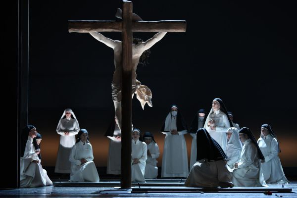 „Suor Angelica“ wird in einem minimalistischen Bühnenbild geboten. Die Bühne öffnet und schließt sich, gibt unterschiedliche Einblicke. Die Nonnen führen ein karges Dasein. Einzige Freude ist die Fontäne eines Brunnens und ein leibhaftiger Esel. Sehr autoritär agiert die Äbtissin in diesem Kloster.