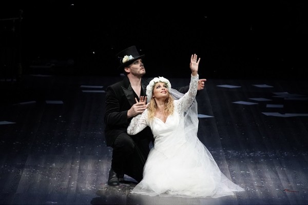 Der österreichische Regisseur Philipp M. Krenn versucht sich bei seinem Troubadour an einer übersinnlichen Deutung. Dazu hat er die Welt der Geister ins Visier genommen, spiegelt einzelne Figuren, hüllt sie in an Schleier erinnernde Plastikfolien und bemüht die Symbolismen des mexikanischen Día de los Muertos, um seine düstere, obskure Interpretation zu visualisieren. Einen Mehrwert für das Verständnis der ohnehin schon verworrenen Geschichte bietet dieser Ansatz nicht und auch das Programmheft des Staatstheaters Wiesbaden leistet dabei keine Hilfestellung, erschöpft sich eher in Besinnungsaufsätzen über Rache, Liebe und Schicksal, anstatt das Regiekonzept in irgendeiner Form zu erklären – wenn es die Regie selbst schon nicht tut. Dabei hat der Bühnenbildner Rolf Glittenberg dem Regisseur eine eindrucksvolle, Verfall und Melancholie preisgegebene Kulisse auf die Bühne gestellt, historische Möbel (außer der Badewanne, deren Sinn sich mir ebenso wenig erschlossen hat wie der Regieansatz selbst) verstärken zusammen mit den hinreißenden Kostümen, die seine Frau Marianne Glittenberg entworfen hat, die Morbidität der Szene. Meisterlich hingegen führt Krenn die Personen und den von Albert Horne exzellent betreuten Chor, der immer die passende Stimmung parat hat – ob als kämpferische Soldaten, okkulte Totenmasken oder als zarter Nonnenchor – und darüber hinaus mit einem hohen Maß an Präzision glänzt.