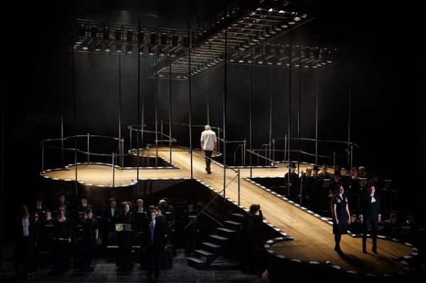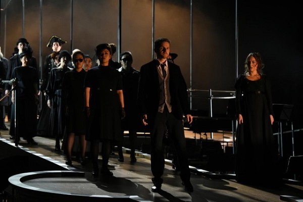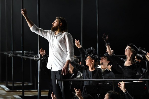 Die beiden Kreuzbalken dienen bloß als Laufstege, auf denen die Protagonisten mal herumschreiten, mal verharren. Der Chor findet seinen Platz links und rechts davon. Die längste Zeit sitzt oder steht er einfach da. Irritierend ist, daß die Chorsänger Notenpulte vor sich haben. Der Inszenierungsgedanke dahinter erschließt sich nicht. Womöglich war es ihnen einfach nicht möglich, den Text auswendig zu lernen, so daß die Regie das Aus-den-Noten-Singen einfach mitinszeniert hat. Gekleidet ist der Chor in wahllos erscheinende Kostüme aus mehreren Jahrhunderten, die von der Trauerfarbe Schwarz dominiert werden. Mitunter werden Sonnenbrillen getragen, warum auch immer. Leider läßt die Textverständlichkeit des Chores zu wünschen übrig. Er bewältigt ansonsten seine umfangreichen Einsätze musikalisch insgesamt ordentlich. Wenn man einen Opernchor dabei im Hinblick auf Lockerheit bei den Koloraturen und Transparenz im polyphonen Partiturgeflecht nicht an den Maßstäben mißt, die auf Barockmusik spezialisierte Ensembles setzen, kann man mit der Leistung zufrieden sein.