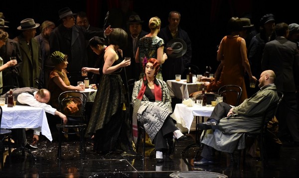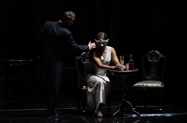 Die blutigen Gegebenheiten um den gewaltsamen Tod des Schwedenkönigs Gustav III. der 1792 auf einem Maskenball Opfer eines Attentats von Verschwörern wurde, weil er die Privilegien des Adels abschaffen wollte, hatte Eugene Scribe, vielbeschäftigter Schriftsteller und Librettist, zu einem Drama verarbeitet, in dem er dem König ein amouröses Verhältnis zu Amelia, der Frau seines besten Freundes, andichtete. Neben Daniel-François-Esprit Auber, der das Werk 1833 vertonte, diente die Dichtung dem Librettisten Antonio Somma als Vorlage für Giuseppe Verdis Oper „Un Ballo in Maschera“, die 1859 in Rom zur Uraufführung kam. Den Zugeständnissen an die seinerzeitige Zensur ist es zu verdanken, dass Verdis Werk nicht mehr in Schweden, sondern in Boston spielt, und auch die junge serbische Regisseurin Beka Savić, bis vergangenes Jahr Spielleiterin am Haus, belässt die Handlung in den USA, verlegt sie aber in die 1920er Jahre. Ganz und gar duster sind die Kulissen, Renato ist hier nicht mehr Gouverneur von Boston, sondern eine Unterweltgröße, die seiner Gefolgschaft ein sicheres Auskommen mittels dunkler Geschäfte wie Waffen- oder Alkoholschmuggel ermöglicht. Doch auch mit der Ganovenehre ist es nicht weit her und es regt sich Widerstand gegen den Mafiakönig. Der Galgenberg wird zum düsteren Hinterhofsetting, der Ball am Ende findet in herrlicher, vom Jugendstil inspirierter Kulisse statt (Luis Carvalho hat ein schwarzes Haus auf die Drehbühne gestellt). Selena Orb verpasst vor allem den Damen schillernde und phantasievolle Outfits, die Herren dürfen im Wesentlichen mit Al Capone-Hüten und Gamaschen Zeitkolorit zeigen. Lediglich das grobe Licht von Andreas Frank zerstört bisweilen das stimmige Bild. Gerade die Ulrica-Szene gehört dann doch in obskureres Licht getaucht, damit der wunderbar-mystische Gesang von Romina Boscolo, die mit Leidenschaft und herrlich-androgyner Tiefe die mysteriöse Wahrsagerin mimt, zur vollen Wirkung kommen kann. Denn die Italienierin ist geradezu eine Idealbesetzung für diese Rolle – genau so stellt man sich diese undurchsichtige Figur vor.