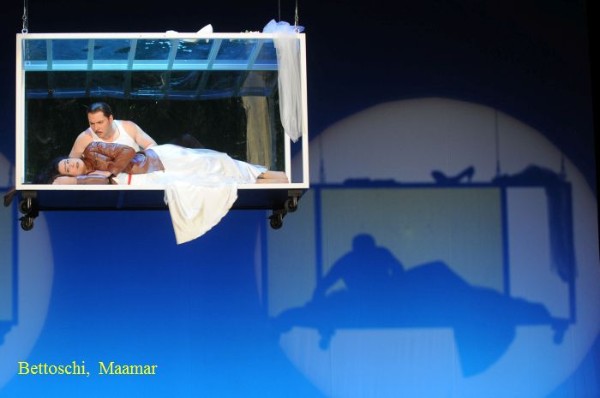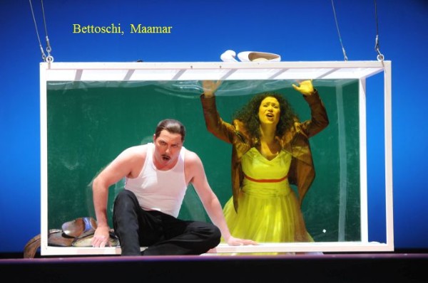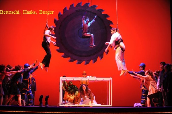 Kongenial war die Regie und Ausstattung von Andrzej Woron, der ein klar strukturiertes Bühnenbild und symbolkräftige Farboptik zum Einsatz brachte. Das Bühnenportal wird von einem großen Rahmen mit LED-Lämpchen begrenzt, die mal weiß, mal rot leuchten, etwa wenn die Braut und Leonardo sich (wieder) näher kommen. Rot ist die Farbe der Liebe, aber auch die des Blutes. Leonardos Frau und ihre Schwiegermutter sieht man mit Kinderwagen in einer engen, rosaroten Behausung, obwohl deren Situation alles andere als rosarot ist. Die Liebeszene zwischen Leonardo und der Braut findet in einem hoch über der Bühne schwebenden Käfig statt. Auf dem thront später auch der wie ein Clown kostümierte Mond. Und für den tödlichen Zweikampf werden Leonardo und der Bräutigam wie Marionetten an Strippen hochgezogen, wobei im Hintergrund eine schicksalsdräuende Kreissäge zu sehen ist.
