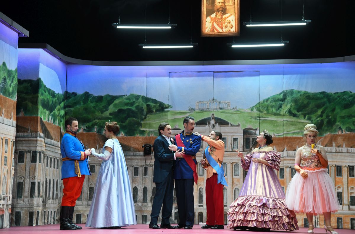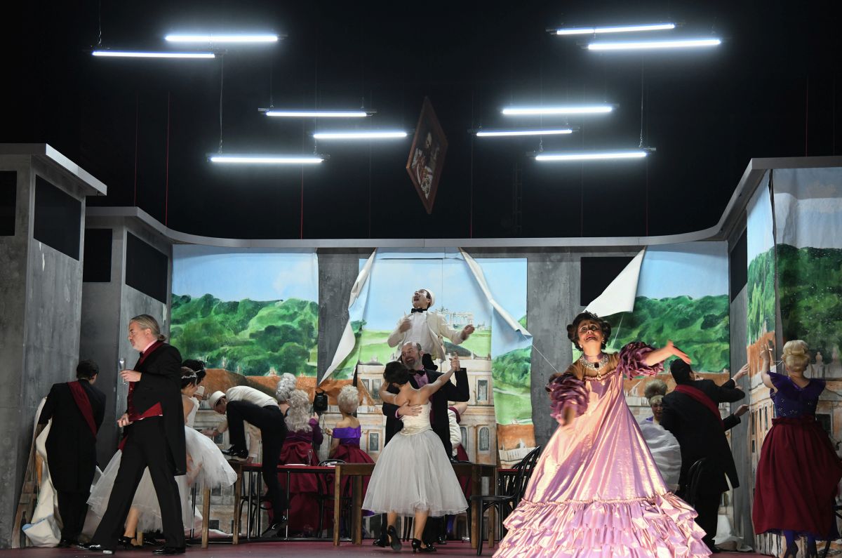 Aber Kranner beschränkt sich nicht darauf, nur eine „heile Welt“ vorzuführen. Von der kann angesichts der festgefahrenen Konventionen ohnehin nicht die Rede sein. Und so kommt es beim Orchester-Intermezzo zwischen dem 2. und 3. Akt zum Knall. Ein Bild des Fürsten schwebt herab und wird zerstört, die Tapeten werden von den Wänden gerissen und legen kahle, graue Wände frei. Es gibt eine Revolution mit einer Massenprügelei und die alte Weltordnung ist zerstört. Hier thematisiert Kranner die Entstehungszeit der „Csardasfürstin“. Aber es gibt auch Hoffnung: Ein Tor wird geöffnet und die Paare entfliehen in eine neue (bessere?) Welt.
