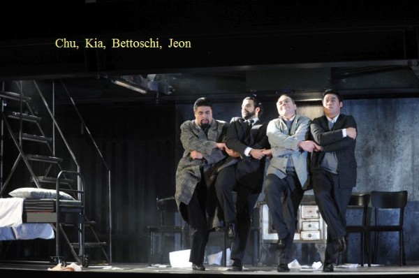 Regine Sturm gab die Musetta regiebedingt vielleicht etwas zu quirlig, stimmlich wurde sie der Partie trotz kleiner Abstriche bei der Auftrittsarie durchaus gerecht. Filippo Bettoschi war ein gestandener Marcello und bot ein starkes Rollenporträt. Das Quartett der vier war ein Höhepunkt der Aufführung. Das gilt auch für die Mantelarie des Philosophen Colline, die Leo Yeun-Ku Chu mit rundem, samtweichem Bass gestaltete. Ebenfalls ein Gast war Manos Kia, der dem Schaunard mit sehr markantem Bariton und attraktiver Bühnenerscheinung überdurchschnittliches Profil sicherte.