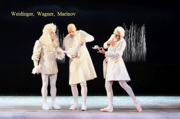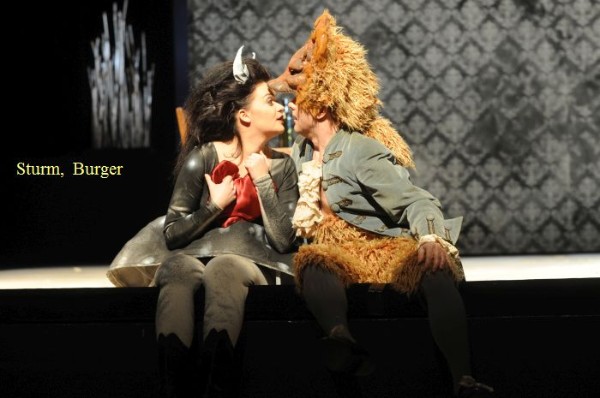 Das Karnevalstreiben im „Musenstall“ wird mit phantasievollen Tiermasken verdeutlicht: Der Dichter Calicot, der seine Spottlieder auf die Pompadour singt, tritt als Fuchs auf, andere als Vögel, Katzen oder Schweine. Graf René, auf den die Pompadour ein Auge geworfen hat, kommt im Bärenfell. Der kahlköpfige Maurepas sieht ein wenig aus wie Nosferatu. Am Hofe Ludwigs sind dann alle in wunderbare, weiße Kleider gehüllt. Puder und Perücke – dazu die schwarz-weiße Optik der Bühne mit ihrer besonderen Ästhetik. Ausstatter Christian Robert Müller hat da viel fürs Auge gezaubert. Dazu hübsche Bilder, wenn die Pompadour auf einer Schaukel sitzt oder wenn zu ihrer (hier umgetexteten) Einlage „Du mein Schönbrunn“ aus der „Kaiserin“ Schneeflocken vom Himmel rieseln.