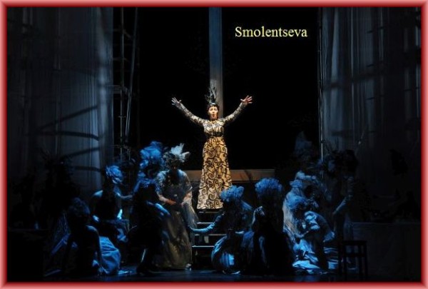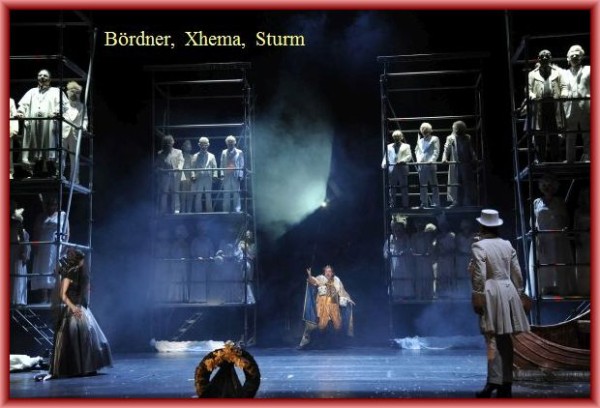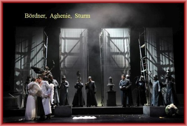 Hovenbitzer und sein Ausstatter Roy Spahn arbeiten viel mit Videos, die auf einen Gazevorhang projiziert werden. Das erzeugt mitunter die Wirkung eines Film noir, ist aber auch oft zuviel des Guten. Als düstere Gruselszene präsentiert Hovenbitzer den 2. Akt. Nebelschwaden, graue Todesengel mit Totenschädeln und ein Grabstein erzeugen die Stimmung eines Horrorfilms. „Nacht des Schreckens“ steht als Überschrift zur Inhaltsangabe im Programmheft.