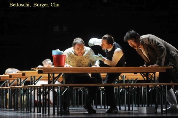 Mit Filippo Bettoschi stand für die Titelpartie ein Sänger zur Verfügung, der mit expressiv geführtem Bariton und mit darstellerischer Intensität alle seelischen Verwerfungen Wozzecks in jeder Nuance beklemmend verdeutlichte. Inga-Britt Andersson war eine Marie voller Lebenshunger, kokett und verzweifelt zugleich. Mit ihrem strahlkräftiger Sopran meisterte sie ihre Partie bis in die extremsten Höhen sehr souverän. Wie immer bereitete Leo Yeun-Ku Chu mit seinem fülligen Bass uneingeschränkte Freude, hier verkörperte er den Hauptmann mit satter Präsenz. Die Tenöre Tobias Haaks und Thomas Burger waren Andres und Doktor, Henryk Böhm als Tambourmajor die Karikatur eines Sexprotzes und Carolin Löffler eine aufreizende Margaret. Der von Jens Olaf Buhrow einstudierte und auch darstellerisch geforderte Chor zeigte sich seiner Aufgabe bestens gewachsen.