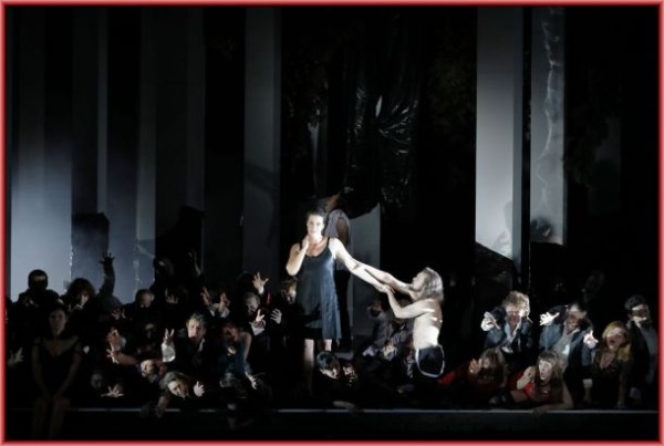 Ihre Stimme strahlt eine herrlich herbe Erotik aus, kann durch Mark und Bein gehen, ohne hysterisch zu klingen. Toll!!! Ja, sie ist ein Naturphänomen, diese Venus – weckt Begehren und stösst in ihrer selbstsicheren Unerbittlichkeit auch ab. Eigentlich hätte man gedacht, die Szene im Venusberg sein eine Steilvorlage für den Regisseur Calixto Bieito, ein Regisseur, der sich in der Regel nicht scheut, Orgien, Sexualität und Gewalt mit handfester Körperlichkeit auf den Opernbühnen des Kontinents zu zeigen. Doch Bieito ist ein kluger Analyst und unterläuft die Erwartungshaltung manches Operngängers mit Subtilität. In dem von der Bühnenbildnerin Rebecca Ringst gestalteten Bühnenraum herrscht eine schwül-tropische Atmosphäre, die feuchte Hitze bringt zum Bacchanal die Venus, diese Frau im schwarzen Unterrock, in Wallung, die kopfüber rumhängenden Bäume sind das Ballett, Venus die einzige Tänzerin. Nebelschwaden, fahles Licht, eine Teichfolie als Boden. Dazu Wagners geniales Vorspiel mit dem für Paris komponierten Bacchanal, welches vom Berner Symphonieorchester unter der Stabführung von Kevin John Edusei mit transparenter Klangkultur gespielt wird, dem soghaften Duktus der Musik aber nichts schuldig bleibt.