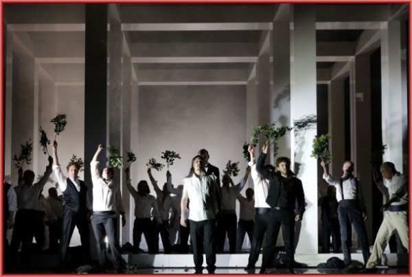 Wunderbar setzt Edusei die geballten Höhepunkte, das Pilger- und Erlösungsmotiv wird mit architektonischer Finesse aufgebaut, bäumt sich hoch – und findet die exakte Entsprechung auch auf der Bühne. Von den sorgfältig herausgearbeiteten Arpeggien der Harfe und den chromatischen Wendungen des Bacchanal geht eine flirrende Sinnlichkeit aus, kann rabiat umschlagen, das gesamte Dirigat ist nie bloss zelebrierend, sondern richtet den Blick nach vorne, bleibt hochspannend, genau wie die Inszenierung, die insgesamt sehr schlüssig gehalten ist. Nachdem Tannhäuser sich dann von Venus losgesagt hat, findet er sich wieder in der Männergesellschaft seiner alten Kumpels von der Wartburg. Diese gebärden sich im ersten Akt wie eine Gruppe von Managern (oder Politikern), welche sich in einem dieser Trainingscamps befinden, wo sie im Wald ihren infantilen Männerritualen frönen dürfen. Sie ziehen sich aus, beschmieren sich mit Blut, Rangeleien um die Hackordnung brechen sich Bann, alles leicht homoerotisch aufgeladen, wenn auch die Sexualität durch eben diese „Bubenspielchen“ quasi ersetzt wird. Bieitos Dauerthema (Männer sind Schweine) schimmert immer wieder durch, auch im zweiten Akt. Hier, in der Halle der Wartburg, ist alles klinisch rein. Die dreischiffige, lichte Säulenhalle strahlt eine emotionale Kälte sondergleichen aus, das Lichtdesign von Michael Bauer unterstreicht diese unterkühlte, lustfeindliche Atmosphäre sehr gekonnt. Und man merkt es von Beginn an, der Tannhäuser wird sich in diese Gesellschaft mit ihren faschistoiden Zügen nie und nimmer einfügen können. Zwar ordnet er sich zu Beginn des Sängerwettstreits noch unter, legt den Hoody und die Schlabber-Combathosen zur Seite, zieht sich Hemd, Fliege, Sakko und feine Hose an (Kostüme: Ingo Krügler), wirft sich auch in Büssermanie bäuchlings auf den Boden wie alle anderen Minnesänger.
