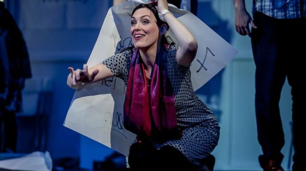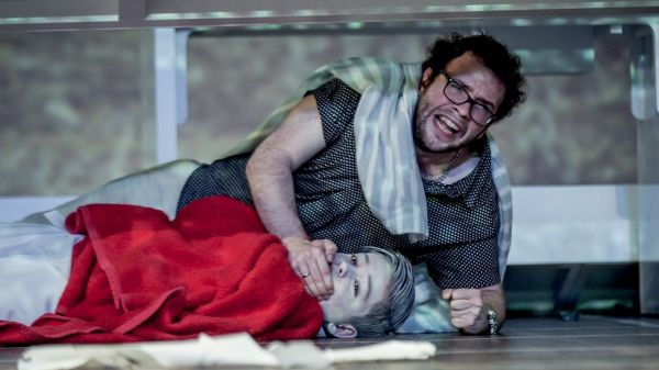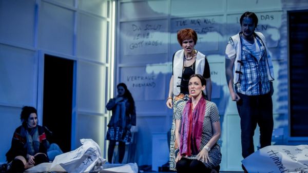 Thomas Dörfler stellte einen weißen Guckkasten gleichsam als Therapieraum auf die Bühne, dessen in Quadrate unterteilte Wände umgeklappt werden können. Das offene Fernster gibt den Blick frei auf Haifa, die Geburtsstadt der Komponistin. Die Alltagskostüme des Ensembles wirken etwas uninspiriert und sind der Gegenwart verpflichtet, wobei die bunte Hose der Mutter Erinnerungen an das glamouröse Popzeitalter heraufbeschwört.