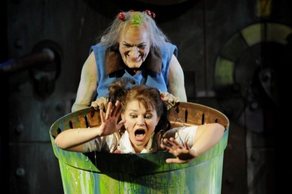 Das Philharmonische Orchester der Stadt Ulm ist an diesem Tag hervorragend aufgelegt und wird von Daniel Montané, der für das Theater Ulm ein wahrhafter Glücksfall zu sein scheint, mit leidenschaftlichem Atem geleitet. Er bringt die wunderschöne Musik Humperdincks zum Erblühen, romantisch, weich, zart, trotzdem auch straff und lodernd, wo es erforderlich ist. Die Musik ist auch das große Plus der gesamten Märchenoper mit warmen, an die Herzen gehenden einschmeichelnden Melodien, die jedoch, wenn es nötig wird auch großer sinfonischer Klangesfülle werden können. In einem Märchen wird auch gezaubert, diese Musik verzaubert in jedem Fall. Erwähnt sei auch der von Hendrik Haas eindrucksvoll einstudierte Opernchor des Stadttheaters Ulm, der seine Sache ausgezeichnet machte. Bei den Sängern, denen man praktisch allen die Freude ansah, in einer einmal etwas anderen Oper aufzutreten, gab es praktisch keinen einzigen Ausfall. Von der Premierenbesetzung blieb einmal Hans-Günther Dotzauer als Hexe. Er hatte das Publikum auf seiner Seite und bot einen schauspielerisch sicherlich über dem Durchschnitt liegenden Part. Fast eine Stunde muss der Arme vor der Aufführung in die Maske und über eine halbe Stunde dauert das Abschminken. Doch jede Minute lohnt den Aufwand, so grausig, verschlagen sieht man selten so eine Hexe. Stimmlich fehlen ihm mitunter die leidenschaftlichen Ausbrüche, dennoch kann er mit seinem ansprechenden Tenor auch hier überzeugen. Genauso überzeugen wie Maria Rosendorfsky als müllmannspielendes Sand- und Taumännchen. Über die Kostümierung kann man sicherlich lange streiten und diskutieren, über ihren sauberen, hellen und zarten, aber dennoch durchdringenden Sopran gibt es jedoch keine Einschränkungen anzubringen, hier kann sie voll überzeugen. Der Besenbinder war auch in Fürth Tomasz Kaluzny, der mit durchschlagskräftigem, stimmschönem Bariton aufhorchen ließ und in Eleonora Halbert eine adäquate Partnerin hatte. Die beiden Rollen sind ja nicht sehr groß, müssen aber auch entsprechend angelegt sein und dies waren sie an diesem Abend. Katarzyna Jagiello konnte als liebreizende Gretel voll überzeugen. Ihr leuchtender, frischer, jugendlicher erblühender Sopran passte hervorragend in die Rolle und auch an der schauspielerischen Gestaltung gab es nichts auszusetzen. Zu Recht wurde sie mit viel Applaus bedacht. Ein ebensolcher Applaus für ihren Hänsel, der von Frauke Willimczik (die in der Premiere die Mutter sang) rollendeckend verkörpert wurde. Ihr kräftiger Mezzo verband sich in idealer Weise mit dem Sopran ihrer Gretel. Beide boten auch eine überaus sympathische Verkörperung ihrer Rollen.