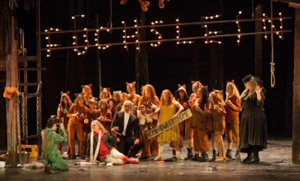 Und nun kann ich mich nicht länger darum herumdrücken und muss doch auch auf die szenischen Umsetzung eingehen: Die Münchner Inszenierung (Regie: David Bösch,Bühne: Patrick Bannwart, Kostüme: Falco Herold, Licht: Michael Bauer, Dramaturgie: Rainer Karlitschek, der auch die wesentlichen Teile des Klagenfurter Programmheftes verantwortet) wurde durch die Spielleiterin der Bayrischen Staatsoper Anna Brunnlechner in Klagenfurt neu einstudiert. Wie man aus Berichten über die Münchner Aufführung entnehmen kann, hat sie das ursprüngliche Konzept offenbar „entschärft“ , drastische Sex-und Gewaltszenen weggelassen – und für eine gut durchdachte Personenführung mit dem neuen Team gesorgt, wie man dankbar registrieren kann. Kurzzusammenfassung der Szene: Alles ist herabgekommen und schäbig, das Försterhaus ein Bretterverschlag, links und rechts des Bühnenportals angenagelte Stofftiere, vom Schnürboden hängen unidentifizierbare Wesen, die vielfältigen Tiergestalten sind überwiegend skurrile Monster (die Mücke mit Blutplasmasäcken ??), ein offenbar abgebrannter Wald, der Landstreicher Haraschta mit vollbepacktem Kaufhaus-Einkaufwagen (statt mit „leerem Rückenkorb“, wie es im Orignal steht), der Dachsbau eine Badewanne mit der Aufschrift „Dax“, insgesamt pessimistische Endzeitstimmung – einzig die Fuchsgestalten sind in Kostüm und Spiel großartige und berührende Figuren aus einer Welt zwischen Menschen und Tieren.