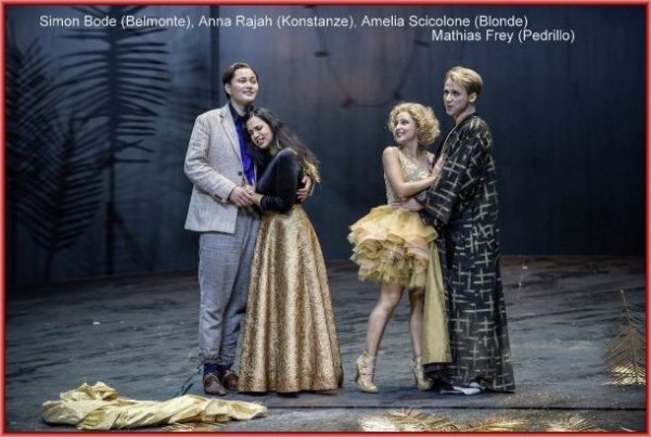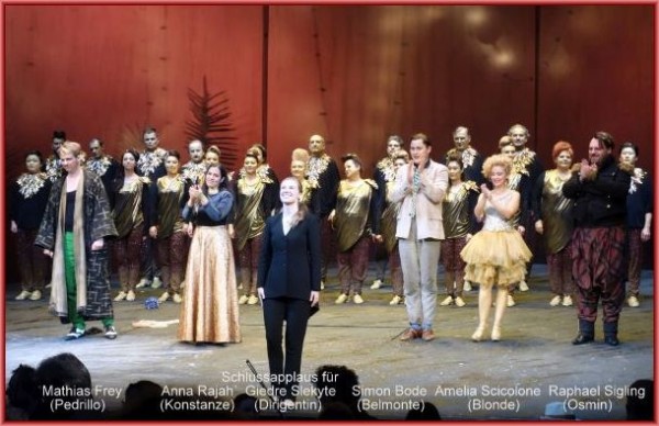 Ein Operndebütant ist auch der Regisseur Michael Schachermaier – da gibt es allerdings leider kaum Positives zu vermelden. Das Stück ist einem Einheitsszenario (Bühne und Kostüme: Jessica Rockstroh) angesiedelt – durchscheinende Plastikbahnen als Rundhorizont mit Leuchtschnurketten und Palmzweigen. Die angestrebte märchenhafte Stimmung kommt nicht auf, vor allem weil es keine substantielle Personenführung gibt. Der Regisseur sagt im Programmheft u. a.: ….dieser Serail ist ein unglaublich fokussierter Raum, hier liegen die Gefühle offen… die verschiedenen Gefühlsschichten der Liebenden zu überprüfen war mir wichtig… Das klingt durchaus plausibel, wird aber nicht zur szenischen Realität – das Ganze war eher eine bieder bebilderte konzertante Darbietung – und in einzelnen Teilen, etwa bei der Führung des (ambitioniert singenden) Chors geradezu peinlich dilettantisch – schade! Das junge Sängerteam tat sein Bestes – allerdings auch hier gab es so manche Schwächen.