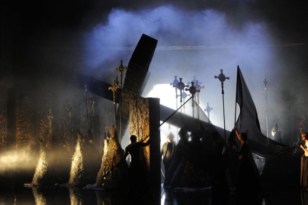 So wie zuletzt in Graz bei „Maria Stuarda“ (siehe den Bericht vom 30.3.2012) lagen „Regie, Licht, Bühne und Kostüme“ in einer Hand – in der Hand des Italieners Stefano Poda. Auch bei dieser Inszenierung gelingen ihm wunderbare, düstere und nebeldurchwehte Bilder – auch hier wendet er das Mittel der drastischen Verlangsamung des Geschehens an. Er schafft eine geradezu irreale Atmosphäre mit vielen Statisten, deren Funktion sich nicht immer erschließt. Selbst die – von Puccini „molto lontano“ gewünschte – Schäferstimme im letzten Akt wird zu einer seherinnenhaften Frauenfigur im Zentrum der Bühne. Stefano Poda ist die bildhafte, statische Wirkung wichtig. Diese erzielt er – aber das ist unzweifelhaft ein ungeeignetes Mittel, um das umzusetzen, was im Programmheft zurecht wie folgt beschrieben ist: „Tosca ist ein brillanter Reißer und Puccini wußte, was ein Reißer vor allem braucht: Tempo.“ Und gerade dieses Tempo und dieses Reißerhafte fehlten an diesem Abend völlig.