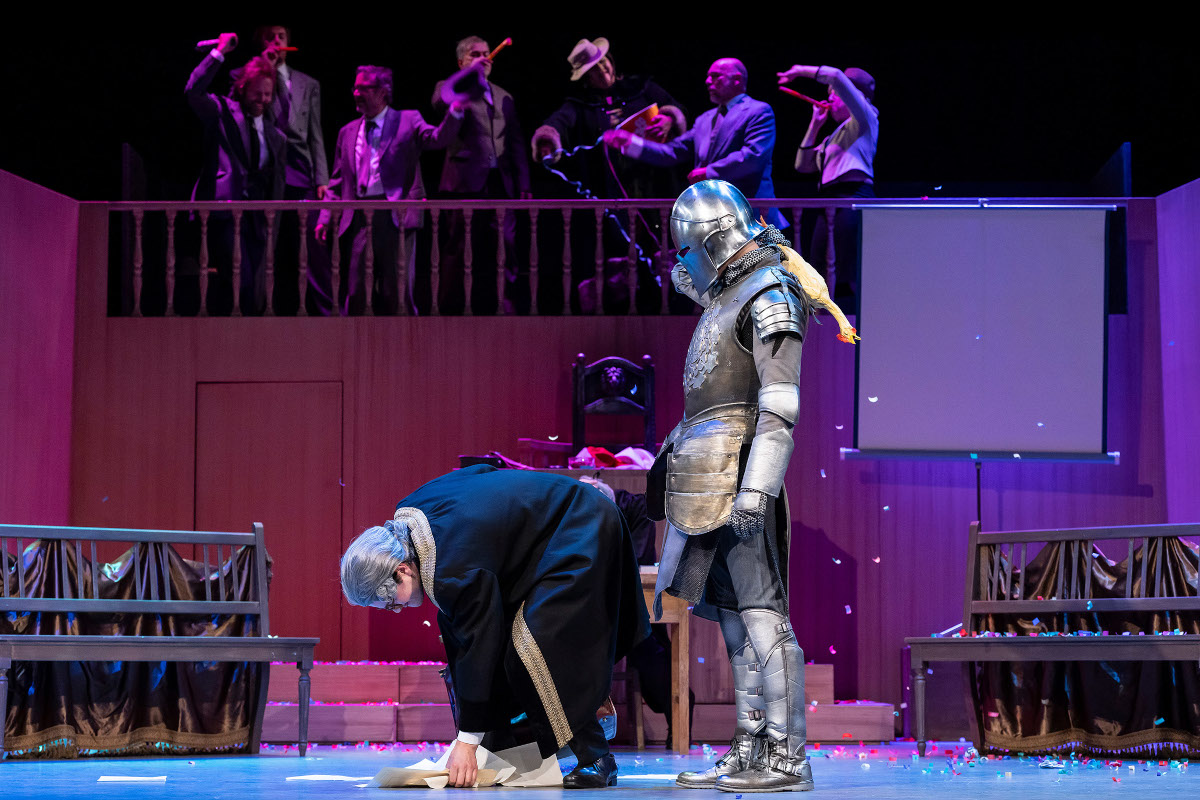 In Passau wird die Verbindung nicht allein durch die beiden betont sachlichen und spieltechnisch höchst praktischen, Oben und Unten verbindenden Bühnenbilder von Karlheinz Beer gestiftet, der mit dieser Arbeit nach 28 Jahren sein vermutlich letztes Bühnenbild für das Landestheater Niederbayern entworfen hat. Die Verbindung wird schon durch eine Gestalt hergestellt, die man aus Monty Python’s Flying Circus kennt: ein Ritter mit totem Huhn, der gelegentlich mit demselben herumwedelt und die Protagonisten schlägt. Der Sinn? Es gibt keinen – sonst wär’s ja auch keine Anspielung auf die britische Komikertruppe. Während Trial by Jury eine fast tänzerische Beweglichkeit offenbart, wie sie durch die Vaudeville-Musik vorgegeben wird (natürlich könnte man, wenn man Christoph Marthaler oder Robert Wilson hieße, das Ganze auch statisch inszenieren), glänzen in Gianni Schicchi die Personen durch eine individuelle Körpersprache und Mimik, aber natürlich kommt’s in erster Linie auf die Sängerinnen und Sänger an. Der Richter, der in seinem berühmten Selbstdarstellungs-Song fröhlich all jene Verfehlungen bekennt, die dem Angeklagten zur Last gelegt werden, ist Peter Tilch, er spielt auch den Marco, Emily Fultz ist Angelina und Nella, Edward Leach Edwin, der Angeklagte, später Rinnuccio. Leni Bäumler ist die „Frau im Schrank“, sie ist die Regieassistentin der Produktion – und tritt in einer kurzen, stummen und sehr witzigen Statistenrolle als Lady im Dessous auf: gewiss keine trauernde Hinterbliebene des gerade verstorbenen Buosi Donati. Das Passauer Ensemble zeichnet sich durch große Homogenität und Spielfreude aus – und besitzt mit Manuel Pollinger als Gerichtsdiener und Simone („O Simone? Simone?…“), William Diggle als Anwalt der Klägerin und Gherardo und mit Oscar Marin-Reyes als um Würde bemühter Sprecher der Geschworenen und dauerbekiffter Betto di Signa weitere einsatzkräftige Solisten.