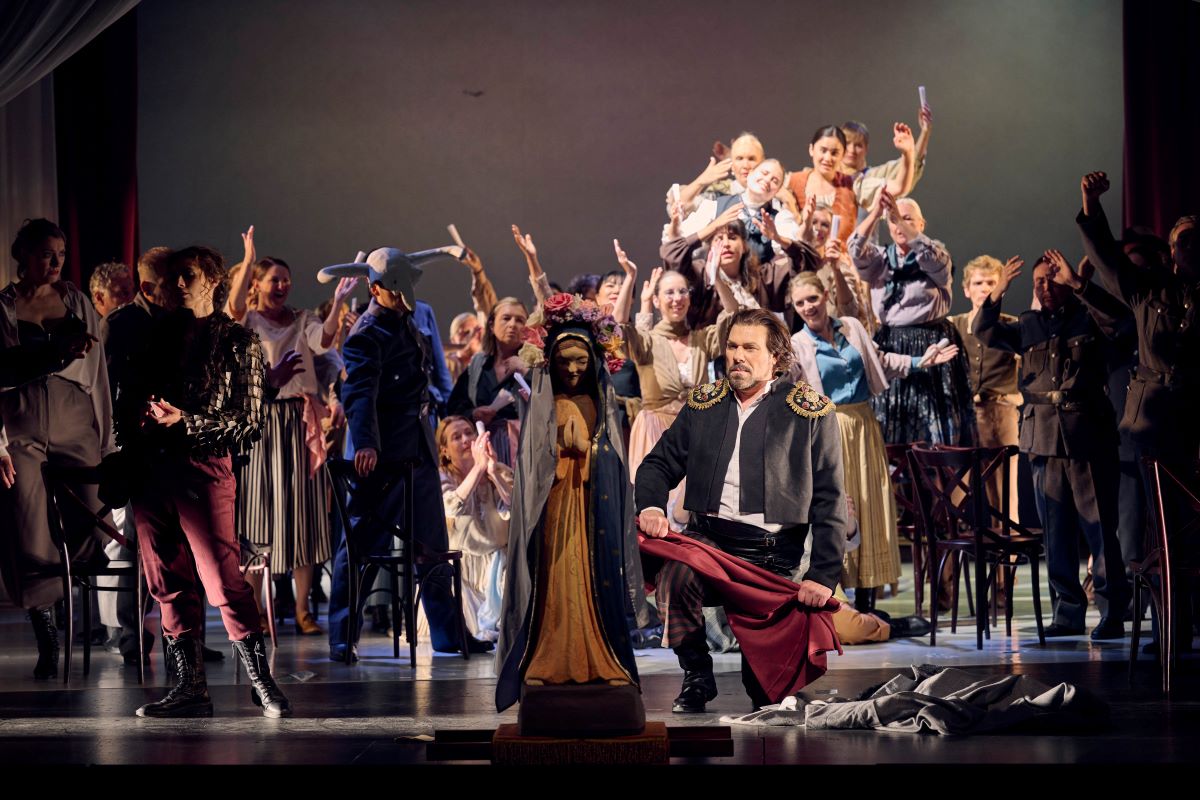 Das Regieteam legte sich mächtig ins Zeug. Von der Aufzeigung billiger Klischees, die man sonst oft mit dieser Oper in Verbindung bringt, hat es Gott sei Dank Abstand genommen. Flamenco, spanische Folklore und dergleichen sucht man in dieser gelungenen Inszenierung vergebens. Vielmehr betont Frau Martin Peragallo bei ihrer Regiearbeit die durch Stiermasken symbolisierte, sich einer konkreten Zuordnung entziehende parabelhafte Komponente der Handlung. Gekonnt stellt sie heraus, aus welchen Motiven es zu dem schlussendlichen Mord an der Titelfigur kommt. Technisch ist ihr dabei nicht das Geringste anzulasten. Sie versteht ihr Handwerk, das muss man sagen. So bezieht sie geschickt den Zuschauerraum in ihre Deutung mit ein. Bertolt Brecht lässt grüßen. Auch sonst spielt Brecht hier keine unwesentliche Rolle. Auf Tschechow`sche Elemente versteht sich die Regisseurin ebenfalls vortrefflich. Manchmal gönnt sie Personen Auftritte an Stellen, an denen Komponist und Librettist für sie solche eigentlich gar nicht vorgesehen haben. So ist beispielsweise Carmen bereits während der ausinszenierten Ouvertüre zu sehen. Sie tritt vor den Vorhang und raucht eine Zigarette, die sie dann fallen lässt. Nachdem sie die Bühne verlassen hat, erscheint Don José, der aufgrund eines Mordvorwurfs aus seiner Heimat flüchten musste, und hebt den Glimmstängel auf. Bereitwillig wird er von Zuniga unter die Soldaten aufgenommen. Auch Micaela bedenkt Claudia Isabel Martin Peragallo manchmal mit Tschechow‘ schen Elementen. Eindringlich geraten ist insbesondere der Schluss, an dem das Mädchen Josés Mord an Carmen beobachten darf. Durch derartige Regieeinfälle wurde die Spannung enorm gesteigert.