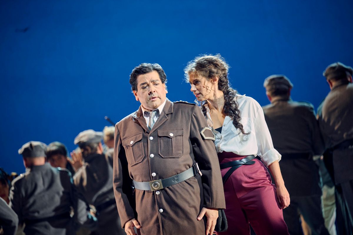 Das Bühnenbild nimmt das Künstliche des Theaterraumes auf. Das Geschehen spielt sich in einem Theater auf dem Theater ab. Strenggenommen sind es gleich mehrere solche Theater, die hintereinander gestaffelt und durch transparente Gazevorhänge voneinander abgetrennt sind. Auf diese Art und Weise entstehen mehrere Räume, die von den Handlungsträgern emsig bespielt werden. Die Portale des Theaters auf dem Theater grenzen die verschiedenen Welten Carmens und Don Josés trefflich voneinander ab. Bemerkenswert erscheint zudem, dass Carmens Hose aus demselben bordeauxroten Stoff gefertigt ist, aus dem auch die Vorhänge des Theaters auf dem Theater bestehen. Die Kostüme sind den Revolutionszeiten des Zwanzigsten Jahrhunderts entlehnt. Dabei bezieht sich Frau Liefers nicht nur auf Spanien, sondern vor allem noch auf Lateinamerika. Politische Konflikte sind hier an der Tagesordnung. Die Schmuggler werden als linke Untergrundaktivisten interpretiert, die sich gegen die diktatorischen Verhältnisse auflehnen. Bezüge auf Lateinamerika gibt es zahlreiche. Diese kommen sogar aus dem religiösen Bereich. Eine Madonna erhält in dieser Inszenierung zentrale Relevanz. So werden die Schmugglerinnen zur Mutter Gottes. Und Don José sieht in Carmen eine Heilige. Sowohl am Anfang als auch am Ende sieht man ein Theaterpublikum auf der Bühne. Am Anfang wartet es auf den Beginn der Aufführung und am Ende reagiert es auf das soeben Gesehene. Auch hier haben wir es mit einem trefflichen Einfall seitens der Regie zu tun. Mit dieser Inszenierung lässt es sich wahrlich leben.