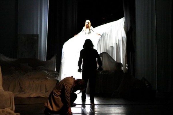 Bettina Lell ist in dem Bühnenbild von Jeannine Cleemen und Moritz Weißkopf, von denen auch die gefälligen Kostüme stammen, eine atmosphärisch dichte, stringente Inszenierung gelungen. Den verborgenen Geheimnissen der Geschwister Usher entspricht es, dass der ganze Raum von zahlreichen überdimensionalen Tüchern dominiert wird, die das Interieur des heruntergekommen Familiensitzes den Blicken entziehen. Bei Frau Lell gerät das Ganze zu einem Kammerspiel Strindberg’scher Prägung. Nicht die äußere, sondern die innere Handlung interessiert die Regisseurin. In einfühlsamer Weise bringt sie die Seelenschichten der Protagonisten an die Oberfläche. Dabei geht es ihr in erster Linie darum, das inzestuöse Verhältnis von Roderick und Madeline, in dem der Wahnsinn der beiden begründet liegt, aufzuzeigen. Dieser wird von Frau Lell als Folge der sich über viele Generationen erstreckenden Inzucht unter den Familienmitgliedern entlarvt. Wahnsinn und Schizophrenie haben dazu geführt, dass Madeline die Sprache verloren hat und nur noch in A-Vokalisen artikulieren kann. Realität und Wahn und die gemeinsame Erinnerung an die unbeschwerten Jugendzeiten, die durch zwei den jungen Roderick und Madeline gleichenden Kindern symbolisiert wird, verschmelzen zunehmend miteinander. Gegenwart und Vergangenheit verdichten sich in der Psyche der Beteiligten zu einem beeindruckenden Geflecht, in dem Schuld und Irrsinn eine zentrale Rolle spielen und das letztlich in einer bedrückenden Hoffnungslosigkeit mündet. Das Ganze nimmt allmählich einen surrealen Charakter an. Insbesondere die zunehmend nur noch in Form von schemenhaften Umrissen hinter transparenten Vorhängen sichtbar werdende Madeline scheint mehr Vision als reale Person zu sein. Die vergnügten Tänze ihrer Kindheit mutieren zu einem Tanz in geistige Umnachtung. Auch die Sexspielchen der Geschwister unter einem riesigen Bettlaken, an denen auch mal der Freund partizipieren darf, scheinen mehr der Seele als der Wirklichkeit zu entfließen. Hier vollführt Frau Lell gekonnt eine Gratwanderung zwischen den verschiedenen Welten. Und genau das ist es, was den großen Reiz ihrer gelungenen Inszenierung ausmacht.