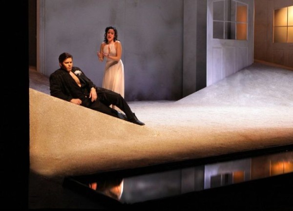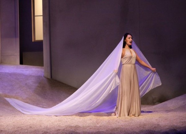 Indes schien Ihrem Kritiker nicht alles überzeugend, was man an diesem Abend zu sehen und zu hören bekam. Das begann schon bei der Inszenierung von Andrea Raabe im Bühnenbild und den Kostümen von Julia Schnittger. Hoch anzurechen ist dem Regieteam, dass es aus Mozarts Singspiel keine altbackene Türkenoper mit exotischem orientalischem Flair gemacht hat, sondern ihm den Stempel des Surrealen aufgedrückt hat. Vielmehr wird der Zuschauer von Frau Raabe in eine Traum- und Phantasiewelt entführt. Im vorderen Teil der Bühne ist ein transparenter Zwischenvorhang angebracht, auf den irgendwann der in der Wüste liegende Landsitz des Bassa Selim projiziert wird und durch den immer wieder in sequenzartigen, schemenhaften Bildern Handlungsträger und Chor kurz zu sehen sind. Zuerst bildet die schmale, von einem querlaufenden Rinnsal eingenommene Vorderbühne die Spielebene. Der hier noch ausgesprochen junge, seinen komischen Charakter nicht verleugnende und lila gekleidete Osmin legt sich da für ein kurzes Schläfchen zu Ruhe, während der ganz in Weiß gekleidete Belmonte in Anwendung eines Brecht’schen Elements aus dem Zuschauerraum auftritt und gleich darauf mit seinem türkischen Widersacher in Streit gerät.