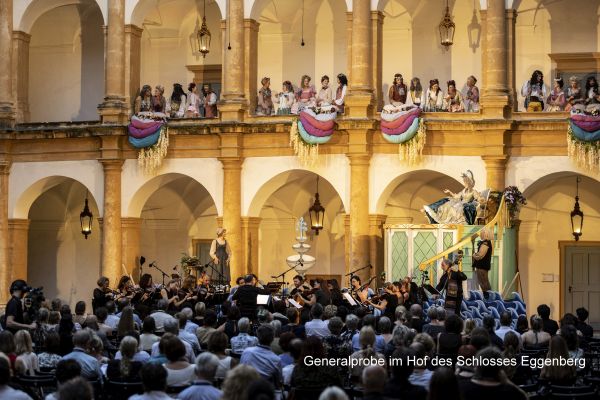 Für die Freiluftaufführung waren als Einleitung im Schlosspark das musikantisch-überzeugende Volksmusikensemble Spafudla und die Uraufführung einer Styriarte-Fanfare von Flora Geißelbrecht vom Balkon des Schlosses vorgesehen. Beides wurde auch im Saal aufgeführt und fügte sich da nicht so recht ins Geschehen. Auch da fehlte schmerzlich das Ambiente von Schloss und Schlosspark. Das Publikum spendete reichen Beifall – wie erfreulich, dass die Aufführungen am nächsten Tag im und um das Schloss Eggenberg stattfinden konnten. Auch für die weiteren Aufführungen am 28.Juni gibt es eine gute Wetterprognose – ich bin überzeugt, dass die Freiluftaufführungen in der prächtigen Schloss- und Parkszenerie wesentlich stimmungsvoller gelingen als in der kargen Helmut-Listhalle.