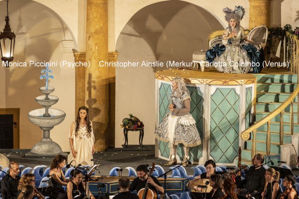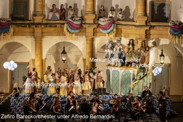 Aber musikalisch gab es sehr Erfeuliches! Auch diesmal war Alfredo Bernardini mit seinem seit über 30 Jahren bestehenden Zefiro Barockorchester das großartige musikalische Kraftzentrum der Wiederbelebung einer Oper, die der habsburgische Kaiser Karl VI zum Namenstag seiner Ehefrau Elisabeth Christine im Jahre 1720 bei seinem Hofkapellmeister Johann Joseph Fux in Auftrag gegeben hatte. Aus dem ausgezeichneten, wie immer auch online verfügbaren Programmheft sei dazu zitiert: „Schon seit 25 Jahren behauptete sich der Steirer in der Phalanx der italienischen Hofkomponisten durch seine originellen Einfälle, seine sanften Melodien und die Kunst seines Kontrapunkts. Auch seine „Psiche“ ist in dieser Hinsicht ein Meisterstück – von der majestätischen Ouvertüre im französischen Stil über die Chöre der Zephire und Amoretten bis hin zu den bewegenden Arien der Protagonisten.“ Fux hatte sein Werk Serenata di Camera bezeichnet – das 20-köpfige italienische Barockensemble spielte die kontrastreiche Fux-Musik großartig in bester Kammermusiktradition mit vielen wunderbaren Soli – etwa in dem nur von Fagott und Cembalo begleiteten heftig-emotionalen Duett Venus/Amor Madre,errai,perdon,pietà.