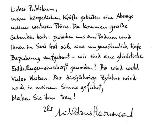Am 5.Dezember 2015, einen Tag vor seinem 86. Geburtstag, verabschiedete sich Nikolaus Harnoncourt mit einem berührenden Brief von seinem Publikum – und er starb am 5. März 2016.