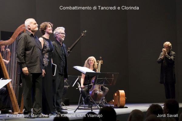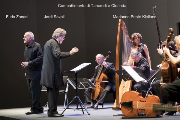 Wenn man erlebte, wie hoch musikalisch, plastisch und spannungsvoll der überaus erfahrene Bariton Furio Zanasi als Testo (Erzähler) in Il combattimento di Tancredi e Clorinda den Text von Torquato Tasso (auswendig!) rezitierte, wenn man die kurzen Einwürfe von Tancredi (Lluís Vilamjó ) und Clorinda (Marianne Beate Kielland ) aufmerksam verfolgte, dann war dies wahrhaft Musiktheater auf höchstem Niveau, das sich auf wenige andeutende Gesten beschränken konnte, weil sich die gesamte Dramatik der Szene durch exzeptionelle Stimmkunst vermittelte. Text und Musik waren hier ideal verbunden. Und das Orchester musizierte ebenso hervorragend – stellvertretend seien für das exzellente Instrumentalensemble Manfredo Kraemer (Violine I) und Andrew Lawrence-King an der Doppelharfe genannt. Und Jordi Savall koordinierte das Ganze mit sparsamen, stets den Gesamtzusammenhang wahrenden Gesten. Es sei nochmals gesagt: das war höchste Kunst – da erlebte man ein musikdramatisches Wunder!