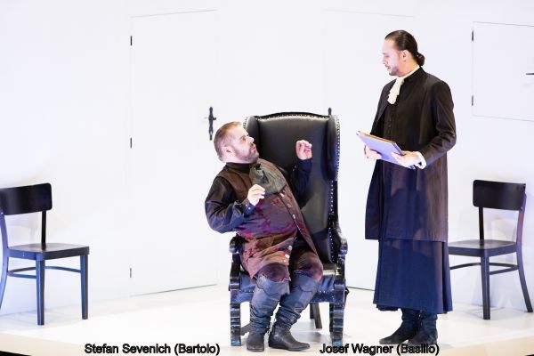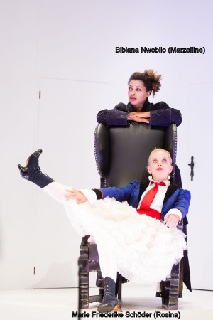 Hingegen hatte die zu einer zentralen Figur aufgewertete Figur der Haushälterin Marzelline (in manchen Fassungen und auch in der gedruckten Fassung der Kollmann-Übersetzung auch Bertha genannt ) genügend Charme zu zeigen – sie stellte noch vor der Ouvertüre die handelnden Personen vor und ist dann aus unerfindlichen Gründen praktisch das ganze Stück hindurch auf der Bühne. Diese Mezzo- bzw. Spielalt-Rolle ist in dieser Produktion mit dem Sopran Bibiana Nwobilo besetzt, die ihre einzige Arie und die Ensemble-Passagen mit Anstand bewältigt. Noch ein Detail des szenischen Arrangements, das ich geradezu störend empfand: als „Hintergrundmusik“ war während der gesprochenen Dialoge unentwegt (leise und gleichsam als Muzak-Kaufhaus-Sound) der allegro con brio-Auftakt aus der Ouvertüre zu hören. Zuerst dachte ich an eine Panne, etwa an eine ungewollte Rückkoppelung der Tonanlage, bis ich die Absicht (nicht aber den Sinn dahinter) erkannte. Und wenn man laut Programmheft mit dieser Produktion in Anspruch nehmen will, auf „ein ganzes Arsenal von Geschmacklosigkeiten, die sich von Generation zu Generation fortgepflanzt haben“ verzichten und „die grobsten Buffa-Klischees ausmerzen“ zu wollen, dann weiß ich nicht, ob die neu eingeführten Scherze geistvoller sind – etwa der Auftritt des als Soldat verkleideten Grafen im Wiener Dialekt oder die Ersetzung von Rosinas Einlagearie durch Adeles „Spiel ich die Unschuld vom Lande“ aus der Fledermaus oder wenn Bartolo bei „Aug und Ohr“ demonstrativ verkehrt auf seine Sinnesorgane weist oder der schon erwähnte Wahnsinnsanfall der Rosina oder, oder, oder…… Ich fand das „szenische Arrangement“ weder lustig noch vermochte ich die angekündigte „scharf geschliffene Gesellschaftskomödie“ zu erkennen.