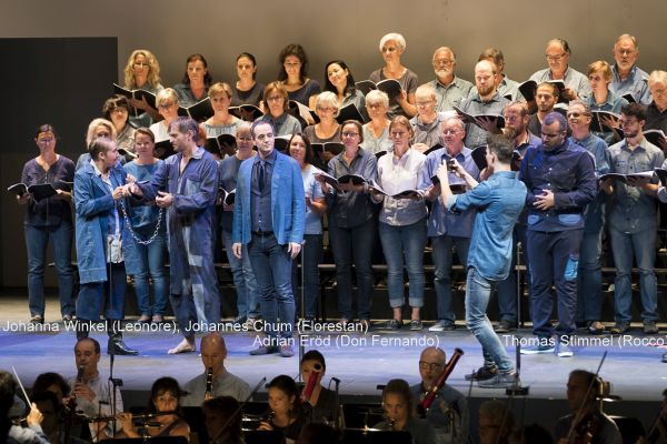 Schwächer leider die beiden Tenöre: Jan Petryka war ein stimmlich recht blasser Jacquino, der auch den Part des 1. Gefangenen übernahm und Johannes Chum war an diesem Abend mit dem Florestan schlichtweg überfordert. Am Ende seiner Arie flüchtete er sich bei der gefürchteten Stelle führt mich zur Freiheit in’s himmlische Reich ins Falsett und er hatte seine seit Jahren bekannte und geschätzte Wortdeutlichkeit zugunsten von Vokalverfärbungen (zur Stimmvergrößerung?) aufgegeben. Schade – er sollte weiterhin beim Jacquino bleiben, wie zuletzt im Theater an der Wien und in Paris. Als Don Fernando war Adrian Eröd eine Klasse für sich. Mit seiner stimmlichen und darstellerischen Autorität zeichnete er großartig die Zwiespältigkeit dieser Ministerfigur. Franz M. Herzog hatte den aus 14 Nationen zusammengesetzten und eigens für diese Aufführung gebildeten Fidelio-Chor ausgezeichnet vorbereitet. Der Laienchor im Alter zwischen 17 und 70 Jahren, darunter auch einige sangesfreudige Migrantinnen und Migranten, war mit großer Begeisterung und beachtlichem Niveau bei der Sache.