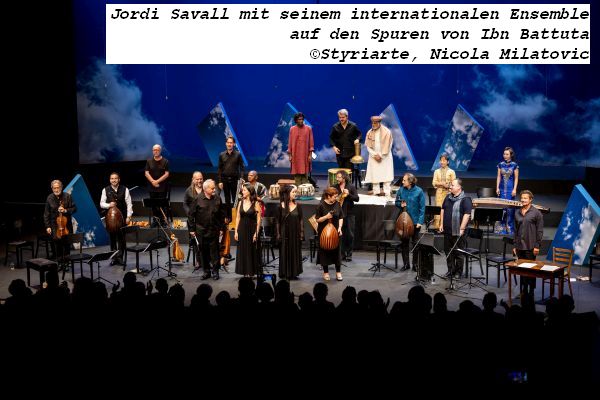 Es war eine bunte Mischung von Menschen aus Europa, Afrika und Asien, die mit ihren uns großteils unbekannten Instrumenten Ibn Battutas Reise des 14. Jahrhunderts von Nordafrika über Mekka, Indien bis China und zurück begleitete. In der arabischen Welt ist jedem Schulkind der legendäre Weltreisende Ibn Battuta bekannt – bei uns in Europa weiß kaum jemand etwas von ihm. Seit einiger Zeit gibt es im C.H.Beck-Verlag eine sehr gute kommentierte deutsche Neuauflage der Reisebeschreibung. Es lohnt sich sehr, sich damit auseinanderzusetzen. Schon Goethe hatte gesagt: „Orient und Okzident sind nicht mehr zu trennen“ – ein wunderschöner Satz, der auch ideal zu Jordi Savall passt, der diesmal Musikerinnen und Musiker aus Syrien, Marokko, Griechenland, Syrien, Madagaskar, Italien, China, Türkei, Afghanistan. Frankreich und Spanien um sich versammelt hatte.