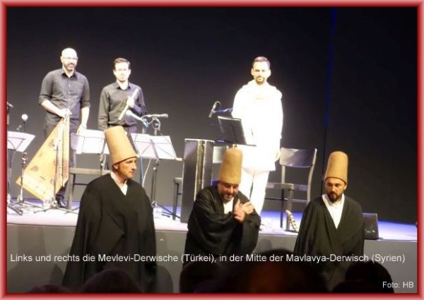 Dank der Hinweise im Programmheft konnte man auch sehr schön den Unterschied im Tanzstil zwischen den türkischen und syrischen Derwischen erkennen: „Die türkischen Mevlevi betonten – als Teil einer asiatischen Kultur – mehr die stille innere Versenkung. Die arabischen