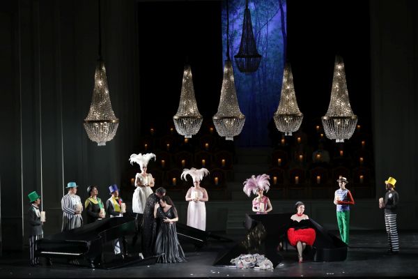 Im zweiten Teil musste man feststellen, dass sich Krassimira Stoyanova mit den tiefliegenden ersten Phrasen mühte, dann aber ihren reifen Sopran schön entfaltete (als Figur war sie von der oben beschriebenen Regieauffassung etwas gehandicapt). Als Zerbinetta lieferte Erin Morley nicht das, was man als brillantes Koloraturfeuerwerk zu bezeichnen pflegt, hielt sich aber anständig und erhielt nach ihrer großen Arie viel Applaus. Das Quartett der Komödianten war mit Samuel Hasselhorn (Harlekin), Jinxu Xiahou (Scaramuccio), Jongmin Park (Truffaldin) und Pavel Kolgatin (Brighella) exzellent besetzt, was auch für das Terzett der Nymphen (Najade: Caterina Sala, Dryade: Rachel Frenkel, Echo: Olga Bezsmertna) gilt. Nicht nur, wenn man bedenkt, dass hier 1963 (allerdings in der leider nicht mehr zur Verfügung stehenden Piccola Scala) Belcantospezialist Luigi Alva den Bacchus sang, erwies sich die stimmliche Leistung von Stephen Gould diesmal wie ein erratischer Block ohne Nuancen.