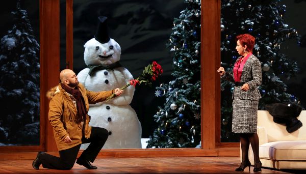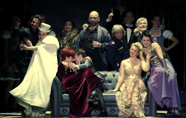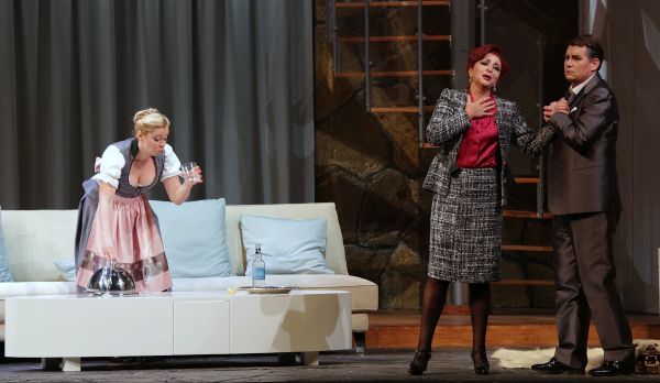 Als Regisseur zeichnete Cornelius Obonya mit Gattin Carolin Pienkos als Co-Regisseurin. Um eine heutige dekadente Gesellschaft zu zeigen, wurde die Handlung kurzerhand nach Kitzbühel verlegt, wobei dieser Name in Italien wohl in erster Linie passionierten Skifahrern ein Begriff ist, denn der italienische Jetset trifft sich im Winter in Madonna di Campiglio. Diese Verlegung gab der Bühnen- und Kostümbildnerin Heike Scheele im 1. Akt die Gelegenheit zur Präsentation eines Villeninnenraums mit riesigen Panoramafenstern und -türen, durch die man die schneebedeckten Berge bewundern konnte, aber auch einen Christbaum (auf dem Alfred zur Beobachtung Stellung beziehen sollte) und einen Schneemann. Weniger originell der Ballsaal im 2. Akt mit den üblichen zwei Treppen. Den darüber schwebenden Sternenhimmel hätte man lieber nicht gesehen, denn die Öffnung nach oben machte den Sängern ihre Aufgabe nicht gerade leichter. Dieser Himmel begleitete uns auch in den 3. Akt, wo man durch eine Drehtür in das „fidele Gefängnis“ gelangte. Die Kostüme waren besonders für Rosalinde und Adele sehr schick (letztere trug im 1. Akt ein Dirndl).