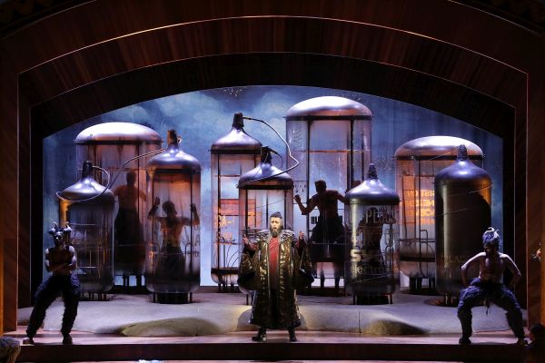 Die Inszenierung lebte vor allem von den Bühnenbildern von Julian Crouch und dem genialen Einfall, ein großes Radio im Stil der Zwanzigerjahre auf die Bühne zu stellen, aus dem die allwissende Muschel vor einem Standmikrophon ihre Mitteilungen macht. Das Radio hat aufklappbare Seitenflügel und gibt den Blick auf die verschiedenen Schauplätze frei. Wunderschön die glitzernden Kostüme der Damen Helena und Aithra von Mark Bouman. Auch die Beleuchtung von Fabrice Kebour und die Videos von Josh Higgason trugen viel zur optischen Wirkung bei, denn die Regie von Sven-Eric Bechtolf war eher statisch und sah nur für Aithra ein stärkeres Bewegungsvokabular vor (das von Eva Mei auch entsprechend bedient wurde). Die für das Off gedachten Einwürfe des Chors erklangen aus den Proszeniumslogen, exakt geleitet von Bruno Casoni.