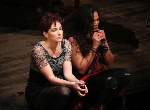 Die kleine Gruppe geladener Journalisten sah, dass Regisseurin Irina Brook (auch für Bühne und Kostüme verantwortlich) beide Stücke im selben, unveränderten Rahmen spielen lässt – einem Podium, auf dem eine Bar aufgebaut ist, in der sich seltsamerweise auch ein rot umkränztes Madonnenbild befindet. Dahinter sind von Zeit zu Zeit Projektionen in schwarz-weiß von einem Wohnwagen mit seinen Bewohnern zu sehen. Vier Personen männlichen Geschlechts (eine davon – wie von Weill gewünscht – in der Rolle der Mutter) kommentieren die Entwicklung von Anna II, die von ihrer Schwester Anna I unter immer neuen Vorwänden in die titelgebenden Todsünden hineinmanövriert wird, um Geld für ein Eigenheim der Familie zu machen, denn nichts anderes sind die vorgenannten Vier. Während sie sich z.B. in bunter Freizeitkleidung auf Campingstühlen vergnügen, muss sich Anna II in einer Peepshow prostituieren. Seitlich des Podiums sind Kleiderständer positioniert, bei denen die Darsteller sichtbar sind, während sie sich dem Inhalt der Episoden gemäß umziehen.