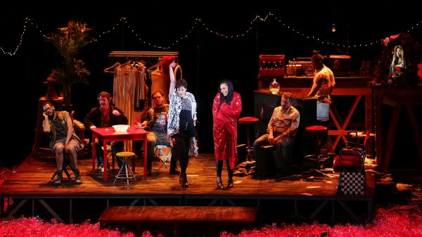 „Mahagonny-Song“ ist recht interessant, wenn man die komplette Oper „Aufstieg und Fall der Stadt Mahagonny“ kennt, handelt es sich doch um einen ersten Entwurf, in welchem aber bereits der berühmte „Moon of Alabama“ vorkommt. Hier war ersichtlich, dass die vielen das Podium umgebenden leeren Wasserflaschen aus Plastik das Meer suggerieren sollten, das die Personen der Handlung queren müssen, um in einem Boot in Mahagonny anzulegen. Die Euphorie der Figuren erlischt bald zwischen Überfällen (der Schauspieler Martin Chishimba aus Sambia, der auch im ersten Teil mit Glitzerkleid den Barmixer gegeben hatte, wird zum Opfer, zeigt sich später aber weiß gefiedert, was mir rätselhaft blieb) und Sauforgien.