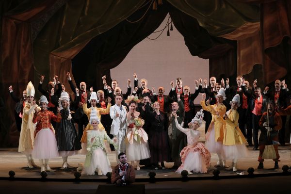 Als Regisseur Leo Muscato bei der Pressekonferenz von einer Theatertruppe sprach, die Rossinis Oper einstudiert, hegte ich die Befürchtung, neuerlich eine Form von Metatheater zu sehen zu bekommen, wie sie in letzter Zeit allzu häufig (und damit zu billig) eingesetztes Regiemittel ist. Zum Glück war dem nicht so, denn Muscato hatte den Figuren nur verschiedene Aufgaben zugeschrieben, die auf einer Bühne erfüllt werden müssen. Damit wurde Bartolo zum Chef der Truppe, Rosina die Primaballerina, Berta die gestrenge Ballettmeisterin, Basilio Korrepetitor, Fiorello der Konzertmeister und Figaro für alles andere zuständig, wie etwa Schminke, Perücken, Kostüme und Bühnenumbau.