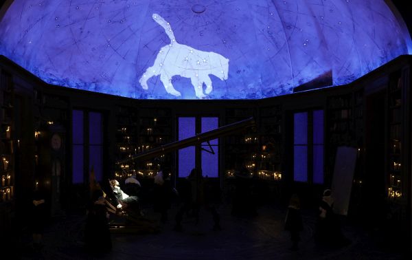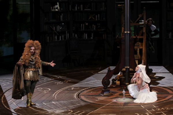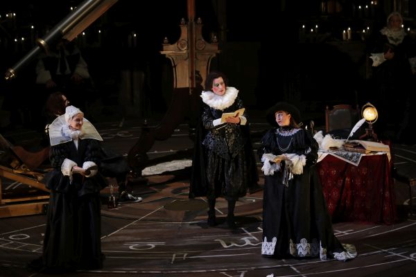 Die Regie von David McVicar trug dieser Situation Rechnung und stellte wiederholt Galileis berühmtes Teleskop in den Mittelpunkt („La Calisto“ wurde 1651 uraufgeführt, Galilei war von der Kirche 1633 gezwungen worden, seine wissenschaftlichen Erkenntnisse zu leugnen). Im noch Monteverdis Beispiel folgenden Prolog diskutieren La Natura, L’Eternità und Il Destino in einem von Rembrandt inspirieren Bühnenbild (Charles Edwards) und entsprechenden Kostümen (Doey Lüthi): Diese waren besonders phantasievoll.