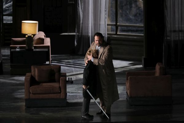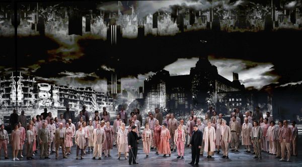 Der böse Spruch vom kreißenden Berg, der ein Mäuslein gebar, soll hier nicht zur Anwendung kommen, aber was die szenische Umsetzung von Verdis zugegeben schwierig zu inszenierendem Werk betrifft, ist diese Feststellung so falsch nicht, beherrschen doch Gigantographien die Bühne, ohne einen besonderen Einfluss auf das Geschehen zu haben. Es ist bekannt, dass Regisseur Davide Livermore ein großer Filmliebhaber und -kenner ist; diesmal hat er sich an Christopher Nolans „Inception“ orientiert, einem Film, der Kinogehern zahlreiche Rätsel aufgab.