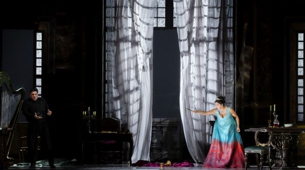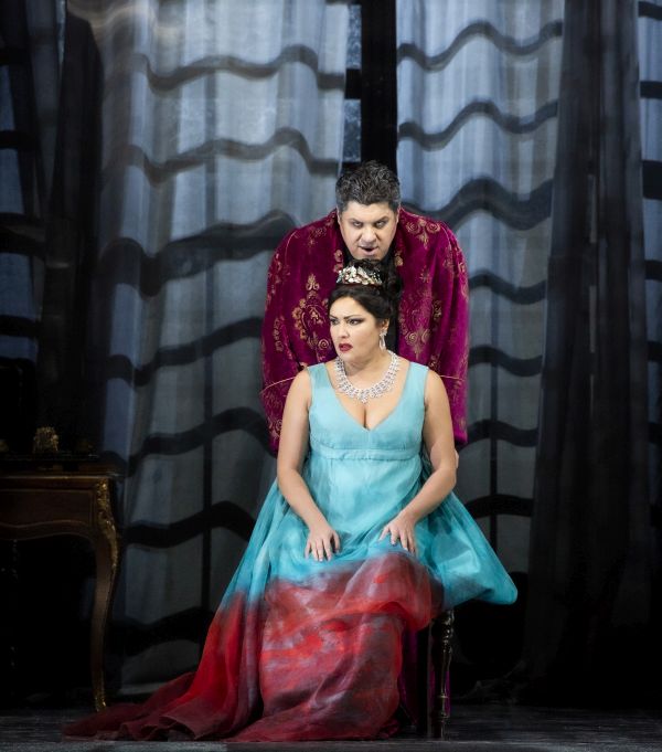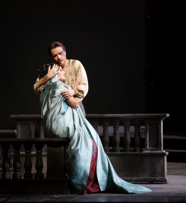 Das Bühnenbild des 3. Akts ist am ehesten passabel, auch wenn der „gestutzte“ Engelsflügel auf Castel Sant’Angelo nicht sehr beeindruckend ist (Bühnenbild: Giò Forma, Licht: Antonio Castro). Damit kommen wir zu den Kostümen (Gianluca Falaschi): Für mich gelungen bei Scarpia und seine Spitzel, im 1. Akt im rostbraunen Mantel, im 2. in einem Morgenmantel, den er während Toscas Gebet genüsslich fallen lässt – einer der wenigen wirklich überzeugenden Regieeinfälle. Cavaradossi trägt eine Art Bundhose, unvorteilhaft geschnitten mit hoher Taille. Kann man Florias eher zeitlose Kombination Rock+Bluse im 1. Akt noch akzeptieren, so ist die türkisfarbene, ärmellose Robe so unvorteilhaft für die Protagonistin, dass ich mich wundere, dass Netrebko nicht ihren Divenstatus ausgespielt und das Tragen verweigert hat.
