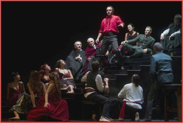 Konnte man angesichts nicht allzu voller Kassen das Bühnenbild von Luca Gobbi, das sich in zwei Treppen jeweils rechts und links auf der Szene erschöpfte, akzeptieren, wollte man angesichts der teilweise überzeugenden Kostüme von Patrizia Chericoni darüber hinweg sehen, dass die Zigarettenarbeiterinnen schwarze, bis zum halben Oberschenkel reichende Seidenstrümpfe trugen, die Freudenmädchen besser angestanden wären, so war der tapfer singende Coro San Gregorio Magno, einstudiert von Mauro Rolfi, vollkommen sich selbst überlassen, was auch für die Solisten gilt. Wer ein gewisses schauspielerisches Talent besaß, ließ sich etwas einfallen, wer nicht, stand hilflos herum (wie leider Don José). Als im letzten Akt ein großgewachsener Farbiger mit Stierkopf und spärlich mit einem Tanga bekleidet hereingetragen wurde, wurde es schwierig, nicht zu schmunzeln, und als José Carmen vor versammelter Menge erstach und diese Menge dann der Toten mit roten Tüchlein zuwinkte, wurde man als Zuschauer ratlos.