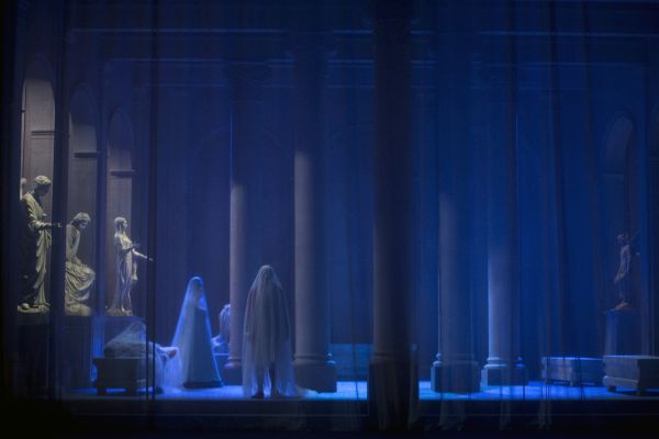 In den das Programm einleitenden Worten des Regisseurs Giorgio Ferrara und seines Dramaturgen René de Ceccatty ist viel vom Dialog eines Atheisten mit dem Tod die Rede, wobei man sich auf den dänischen Philosophen Sören Kierkegaard beruft, dessen Worte denn auch während der Ouverture auf den Vorhang projiziert werden. Alle Figuren sind fast ständig anwesend und betrachten, teilweise unter langen weißen Schleiern, als Untote, als aus den Mausoleen erstandene Figuren das Geschehen um den unermüdlichen Verführer. Die Handlung spielt somit nicht nur auf dem Friedhof, wie in der dafür vorgesehenen Szene, sondern auch in einer Art Krypta. Diese Basis klingt natürlich überzeugend, aber was leider fehlt, ist die szenische Umsetzung dieser Gedanken. Es fehlt also eine Regie, welche die Personen zueinander in Beziehung setzen würde, sodass die Sänger ihrer eigenen schauspielerischen Geschicklichkeit überlassen bleiben.