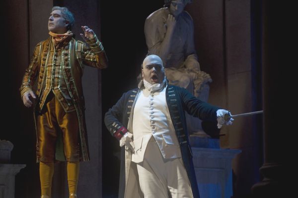 Durch die Kooperation mit Ravenna stand das von Riccardo Muti gegründete Orchestra Giovanile Luigi Cherubini zur Verfügung, wodurch der musikalischen Leiter des Hauses Matteo Beltrami die Möglichkeit hatte, seine Vorstellungen in besonderer Klangqualität umsetzen zu lassen. Man hörte einen Mozart ohne Zuckerguss, wo die dramatischen Töne auch wirklich zugespitzt wurden. Mozart pur sozusagen, mit gerechter Akzentverteilung zwischen den Wörtern „dramma“ und „giocoso“. Die Titelrolle wurde von dem aus Rhodos gebürtigen Dimitris Tiliakos gesungen, der nicht so sehr die feine Klinge führte („Ständchen“!), als er sich wohler fühlte, wenn er stimmlich auftrumpfen konnte, wie in seiner letzten Szene mit dem Komtur. Szenisch wirkte er eher hölzern, was neben seinem Leporello, dem rollenerfahrenen Andrea Concetti, umso mehr auffiel. Dieser sang den schlitzohrigen Diener sehr lebhaft und kam gut über kleine Schwierigkeiten mit seinem nicht mehr sehr frischen Bass hinweg.