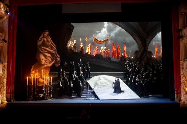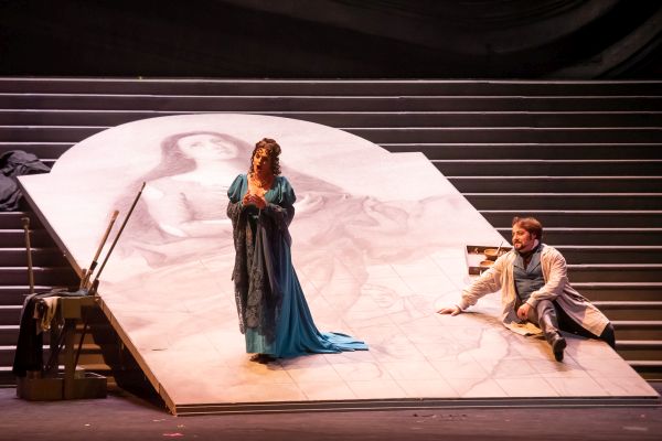 Diese Produktion habe ich schon mehrmals besprochen, war sie doch im Verbund der Theater der Region Emilia-Romagna vor recht vielen Jahren für Parma herausgekommen, als Raina Kabaiwanska Abschied von einer ihrer Lieblingsrollen nahm, und wurde seither immer wieder gezeigt. Damals lag die Regie in den Händen des inzwischen längst verstorbenen Alberto Fassini und wird nun regelmäßig von Joseph Franconi Lee betreut, der manch kleine Details hinzufügt bzw. verändert. So schien mir das Auftreten des Folterknechts Roberti (der bekanntlich nichts zu singen hat) neu. Bühnenbild und Kostüme von William Orlandi haben ihren Reiz behalten, vor allem im 1. Akt, wenn di Prozession zum Tedeum hoch oben auf einer lichtdurchfluteten Empore erscheint. Viel sagen auch die zahlreichen Kreuze aller Größen und Macharten auf Scarpias Tisch über die Atmosphäre im Palazzo Farnese aus. Die der Zeit der Handlung zur Wende vom 18. ins 19. Jahrhundert entsprechenden Kostüme für die Protagonistin sind eine Augenweide.