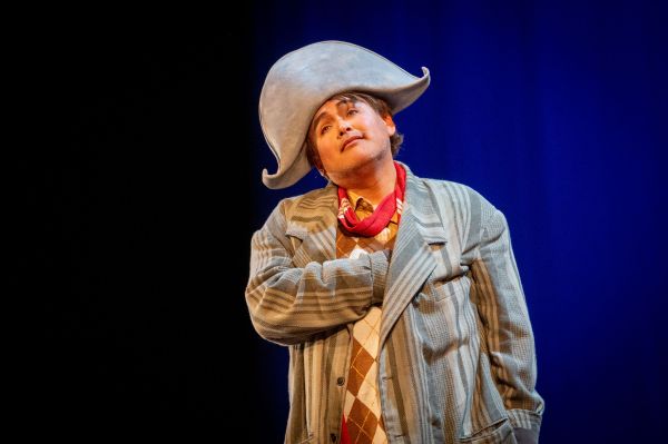 Dieses „melodramma giocoso“, der unsterbliche „Liebestrank“, war die dritte Oper des heurigen Festivals. Die Ankündigung von Frederic Wake-Walker als Regisseur ließ mich Schlimmes befürchten, hatte er an der Scala doch Mozarts „Nozze di Figaro“ schrecklich verunstaltet und vor kurzem in Florenz auch Cileas „Adriana Lecouvreur“ in den Sand gesetzt. Sich in der Geburtsstadt des dem Festival den Namen gebenden Komponisten zu befinden, hatte ihm aber offenbar gut getan, denn er ließ die Handlung im positiv routinierten Sinn ablaufen, ergänzt um einige nette Einfälle, wie z.B. das kleine Kasperletheater , in dem Adina und Dulcamara die Barkarole vom Senator Tredenti und der Nina gondoliera singen. Oder ein verträumter Nemorino mit Luftballon vor einem romantisch glitzernden blauen Vorhang bei der „Furtiva lagrima“. Oder die Kopfbedeckung à la Napoleon, als sich Nemorino zum Soldaten verpflichten lässt. Manchmal erscheinen die Hauptdarsteller als Kinder, aber der Einfall wirkt hier einmal nicht penetrant. Die Bühne beherrscht eine Abbildung der Fassade des Teatro Donizetti (Federica Parolini). Getragen wird hübsche, nicht nachlässig wirkende Alltagskleidung, und bei ihrer Werbung um Nemorino haben die Chordamen elegante große Hüte auf (Kostüme: Daniela Cernigliaro).
