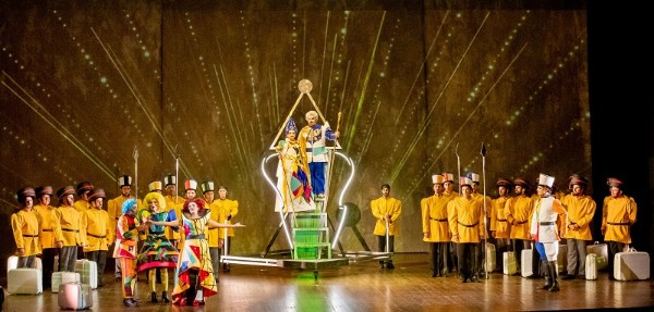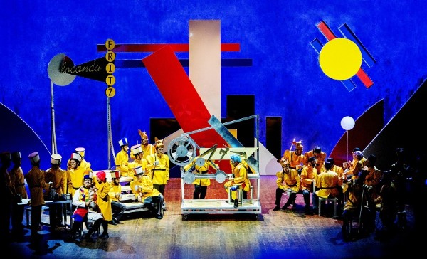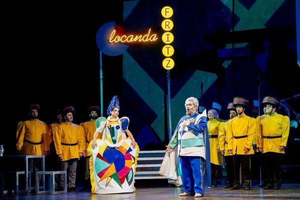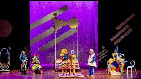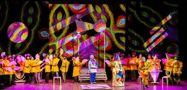 Für die Inszenierung dieses Schwankes hat die Fondazione Donizetti die römische Theaterkompanie Ondadurto gewinnen können und Szene und Kostüme wirken, als hätten sich Mondrian, Kandinsky und ein italienischer Designer aus den 1980er Jahren zusammengetan, um einmal eine Oper auszustatten, so geometrisch geprägt und gleichzeitig so farbig kommen die Bühnenelemente von Marco Paciotti und Lorenzo Pasquali daher. Die originellen und gleichfalls quietschbunt gemusterten Kostüme des K.B. Project sind ein Augenschmaus und passen herrlich ins Konzept, nur Marco Alba treibt es mit den knalligen Videoeinspielungen im wahrsten Sinne des Wortes bisweilen zu bunt. Sie überlagern die Szene und sind mir oft eine Spur zu viel, kreieren an anderer Stelle aber passende Stimmungen, etwa, wenn sie die Einlage einer Artistin ins passende Licht rücken, die eine wunderbare Arie von Annetta untermalt.