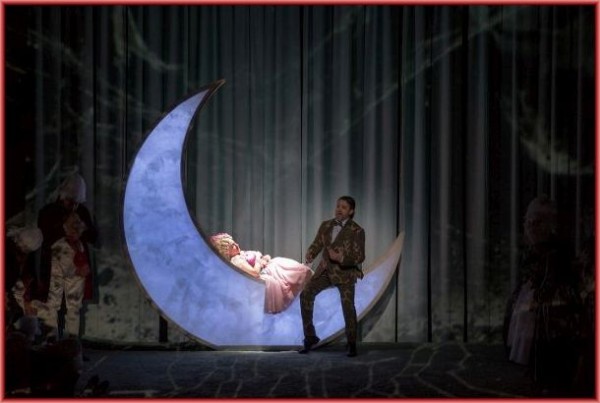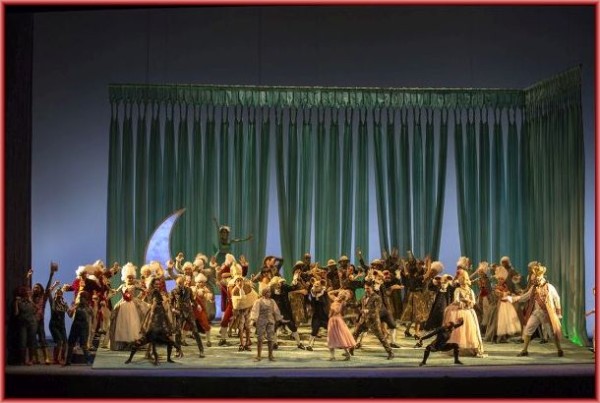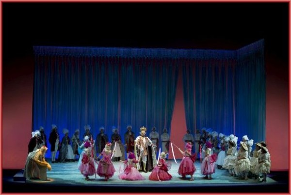 Die Erzählung gibt den Ausstattern natürlich reichliche Möglichkeiten, die von Giada Abiendi (Bühnenbild) und Vera Pierantoni Giua auch entsprechend genutzt wurden. Es gab zauberhafte Landschaften zu sehen, und die Kostümbildnerin konnte sich mit originellen farbigen Kostümen austoben. Mehr als Ergänzung waren die Videos von Fabio Massimo Iaquone und Luca Attilii (eindrucksvoll die das Schloss allmählich bedeckenden Spinnweben), was auch für die Beleuchtung von Alessandro Verazzi gilt. In diesem zauberhaften Ambiente führte Leo Muscato eine liebevoll-ironische Regie, die das rechte Gleichgewicht zwischen der Distanz zur märchenhaften Erzählung und gefühlsmäßigem Mitgehen hielt. Erwähnt seien eine Art sehr köstlicher „Klageweiber“ männlichen Geschlechts oder die ratlosen Ärzte. Seltsam war nur, dass Spinnrocken und Spindel durch Strickwerkzeug ersetzt wurden, ist doch die Spindel eine auftretende „Figur“. Sehr hübsch war die Choreographie von Luigia Frattaroli, bei der sich der jüngste Ballettnachwuchs erfreulich in Szene setzen konnte.