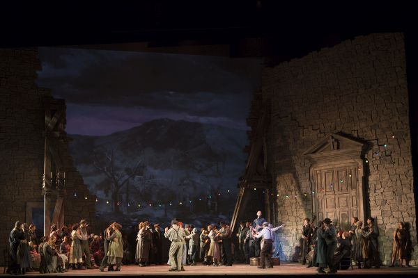 Die Regie von Francesca Zambello sah schon vor Beginn und während der Überleitung von der ersten zur zweiten Szene die Projektion von Originalaufnahmen mit kurzen Texten vor, um dem Publikum die geschichtlichen Grundlagen bewusst zu machen, etwa die Zerstörung der aus dem 6. Jahrhundert stammenden Benediktinerabtei Montecassino durch alliierte Bomben. Das naturalistische Bühnenbild von Peter C. Davidson zeigte den Dorfplatz und die Kirche; es wurde durch Videoeinspielungen von S. Katy Tucker ergänzt, die den Wechsel der Jahreszeiten zeigten.Wichtig auch die Beleuchtung von Mark McCullough, besonders bei sich gleichzeitig abspielenden Szenen, wenn die gerade agierenden Personen herausgeleuchtet wurden. Passend zu den jeweiligen Personen die Kostüme von Jess Goldstein.